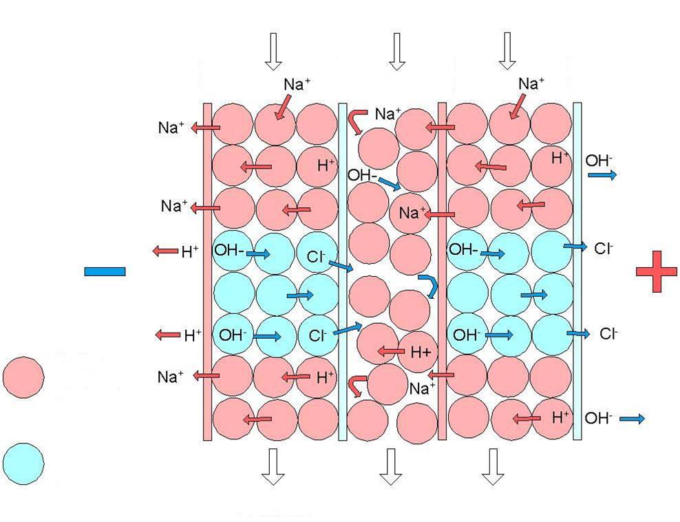 ● 電流促使水分子電解成氫離子H+和氫氧根離子OH-,這些H+和OH-連續再生充填在淡水室內的離子交換樹脂。