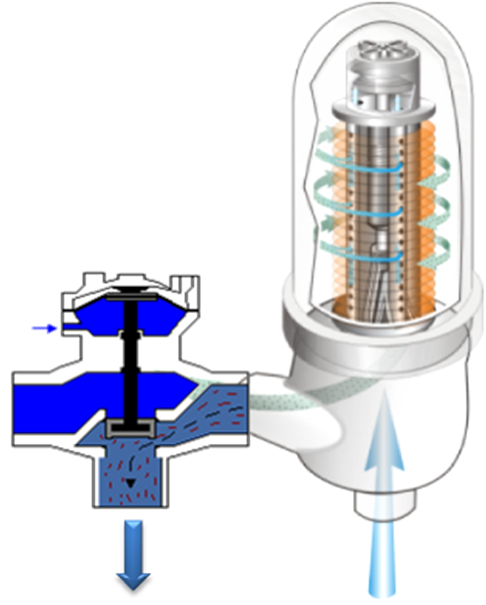 當盤式過濾器疊片之間的溝紋累積大量雜質后,進出口壓差達設定值時(高報警),三通閥門改變過濾單元中水的流向,盤片被頂開,過濾過程中的小孔隙被打開。位于疊片中央的噴嘴沿切線噴水,使疊片旋轉,在水流的沖洗與疊片高速旋轉下,截留在疊片上的固體物被沖洗出去。然后活塞再次下壓疊片,回復過濾狀態。當反沖結束時,水流方向再次改變,疊片再次被壓緊,系統重新進入過濾狀態。